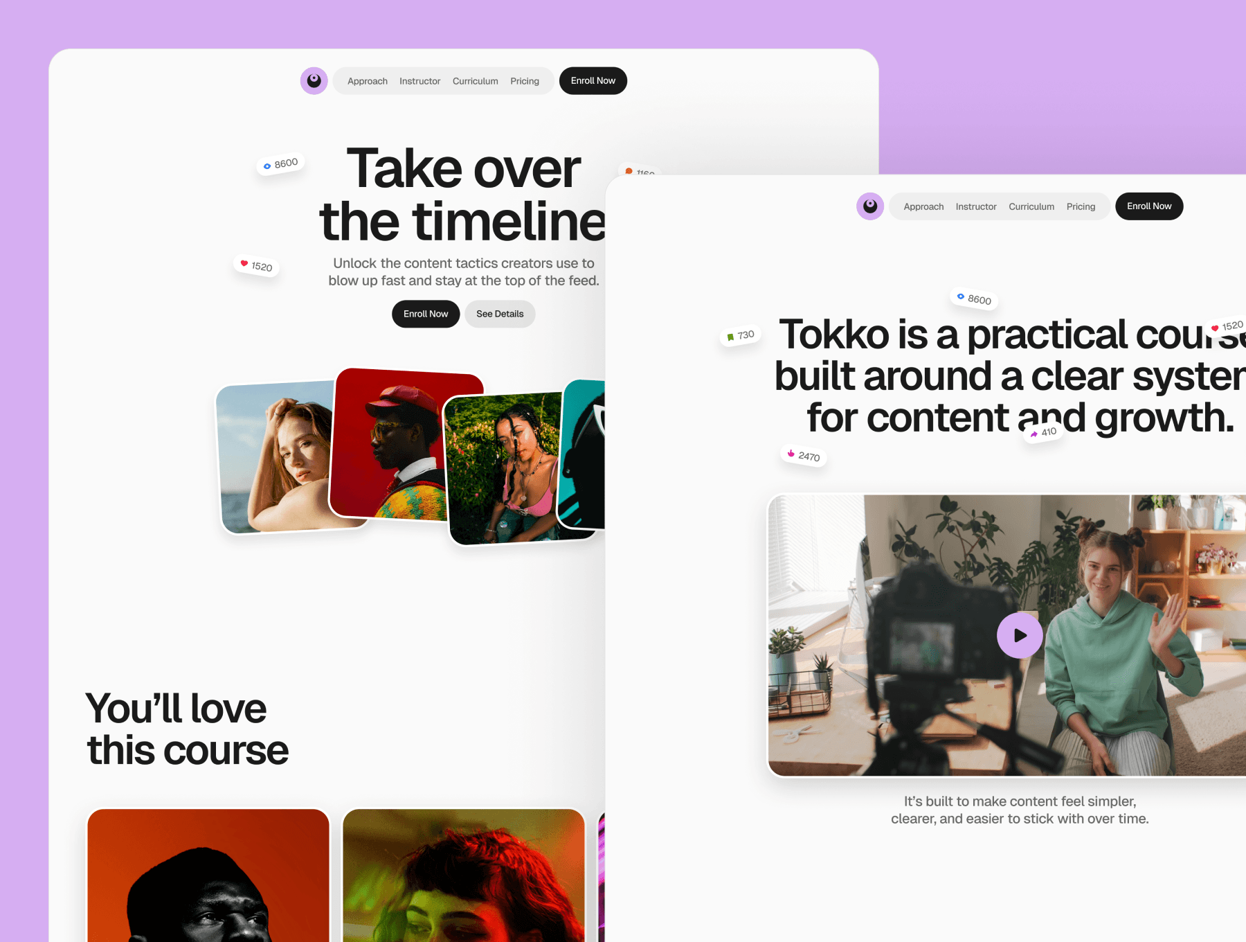 NutsDev designed Tokko as a system-driven, creator-first learning experience that emphasizes clarity and action. The website uses a clean, modern visual language, modular layouts, and strong storytelling to clearly communicate the course value, structure, and outcomes. By focusing on short, digestible content, real creator stories, and a frictionless user journey, the design reinforces trust and positions Tokko as a practical tool for consistent content growth.